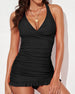 Design: Front Ruched Detail, Longer Top for Tummy Coverage, Built-In Shorts with High Waist Bikini Bottom, Shirred Slimming Effect